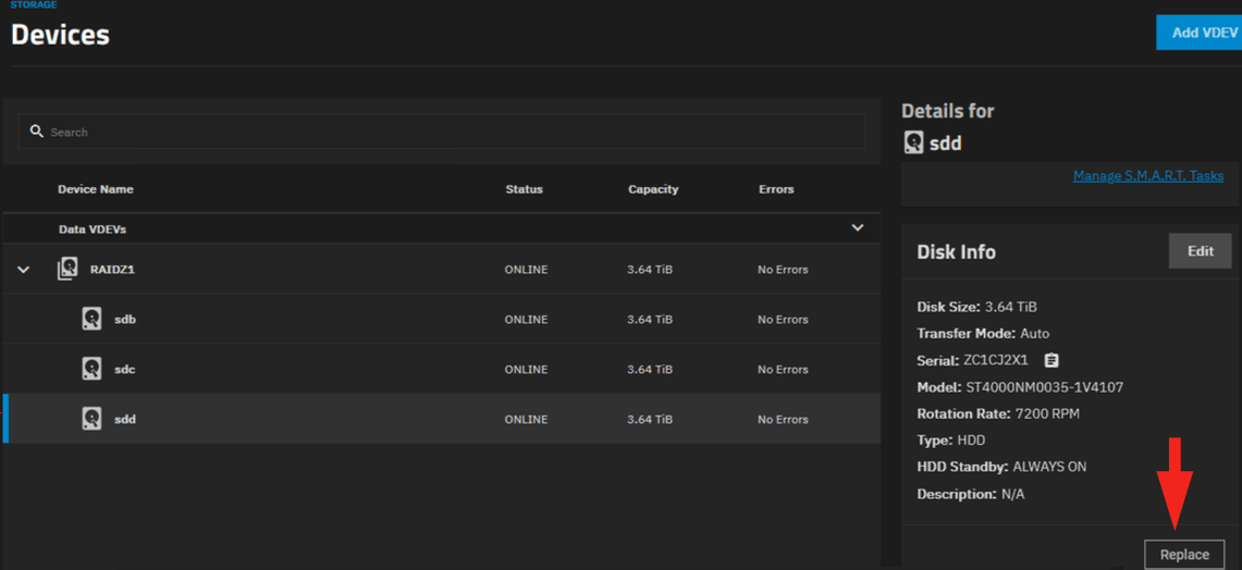 3. Expand the list of "Data VDEVs" and locate the disk desired for replacement. Click on the drive and select "Replace".
