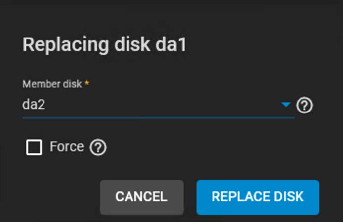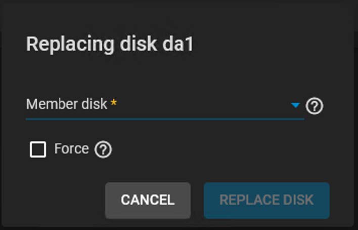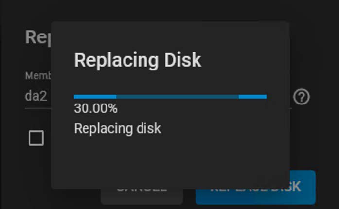 4. A Replacing disk window will appear. Drop the Member disk list and select the new replacement drive. Click Replace Disk to finalize the rebuild with the new drive.