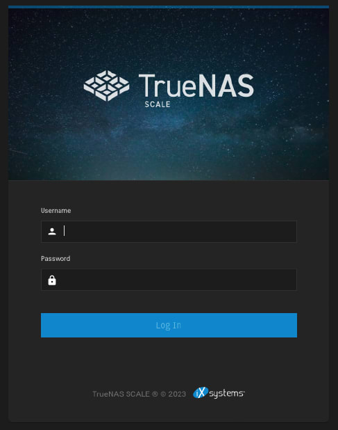 1. Open a web browser of your choice and type in the address bar the device's DHCP IP address (ex. 172.21.124.254) or the device's Static IP address (ex. 192.168.0.10) and press "Enter". A login screen for TrueNAS SCALE should appear. Enter the login credentials: