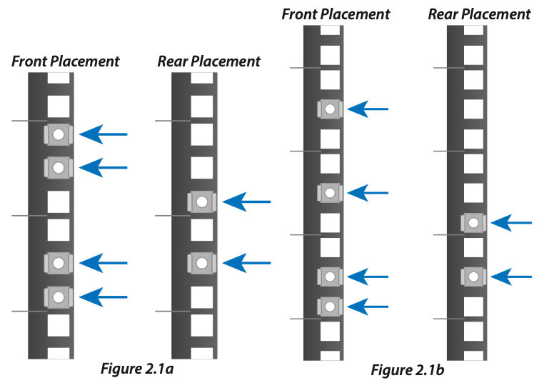 2. Install the included cage nuts into your rack. Use Figure 2.1a as a guide for cage nut placement for an 8-bay Jupiter Kore; use Figure 2.1b for a 16-bay Kore.