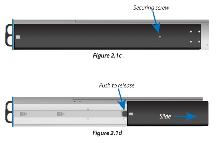 4. Once the securing screws have been removed, remove the rail arm by sliding it toward the rear of the unit as seen in Figure 2.1d. When the rail arm stops, push the release tab while continuing to slide the rail arm off. After removing the rails, set them aside taking note of the side from which they were removed.