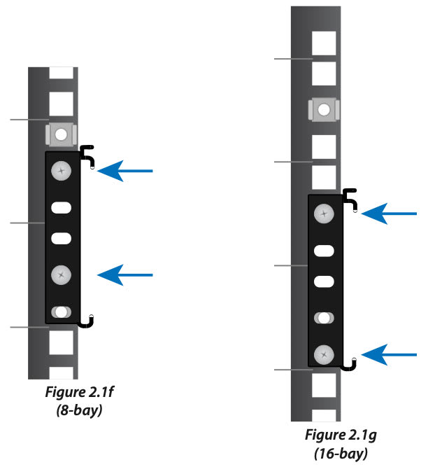 6. Install the front rails, first making sure the bottom of the rail lines up with the bottom of the designated rack units. Using Figure 2.1f as a guide for an 8-bay and Figure 2.1g for a 16-bay unit, secure the rail using two of the included M5 pan head screws.