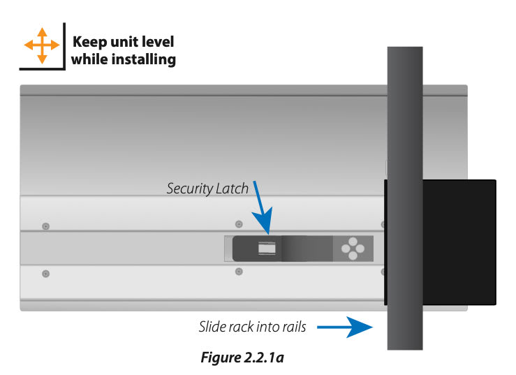 4. Once aligned, evenly slide the unit rails into the rack rails. Do not release the unit until it has been inserted all the way or until an audible click is heard. The click indicates that the Jupiter Kore has been inserted past the security latches as illustrated in Figure 2.2.1a.