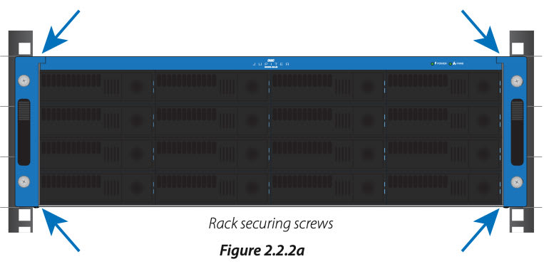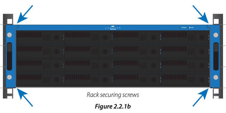 3. Remove the four rack securing screws from the front of the Jupiter Kore as shown in Figure 2.2.2a.