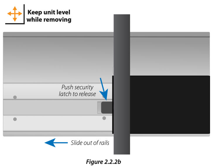 5. It is recommended to have a second person assist the removal at this point. Press the security latches while simultaneously sliding the unit out just past the security latch as illustrated in Figure 2.2.2b.