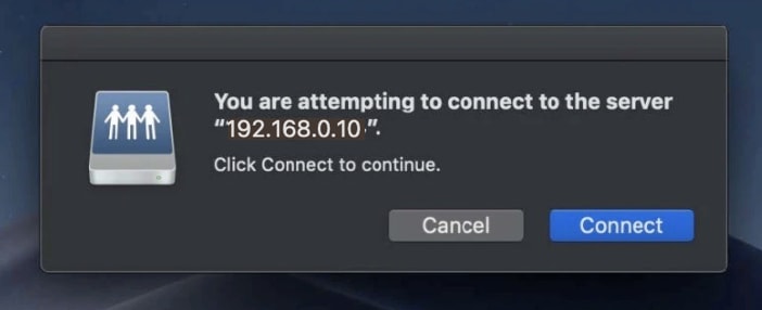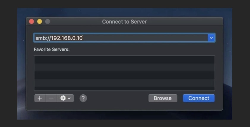 2. If the OWC Jupiter Mini's network was connected using the DHCP Setup, enter the device's DHCP IP address (ex. smb://172.21.124.254). If the OWC Jupiter Mini's network was connected using the Static IP Setup, enter the device's Static IP address (ex. smb://192.168.0.10) as the Server Address and click "Connect".