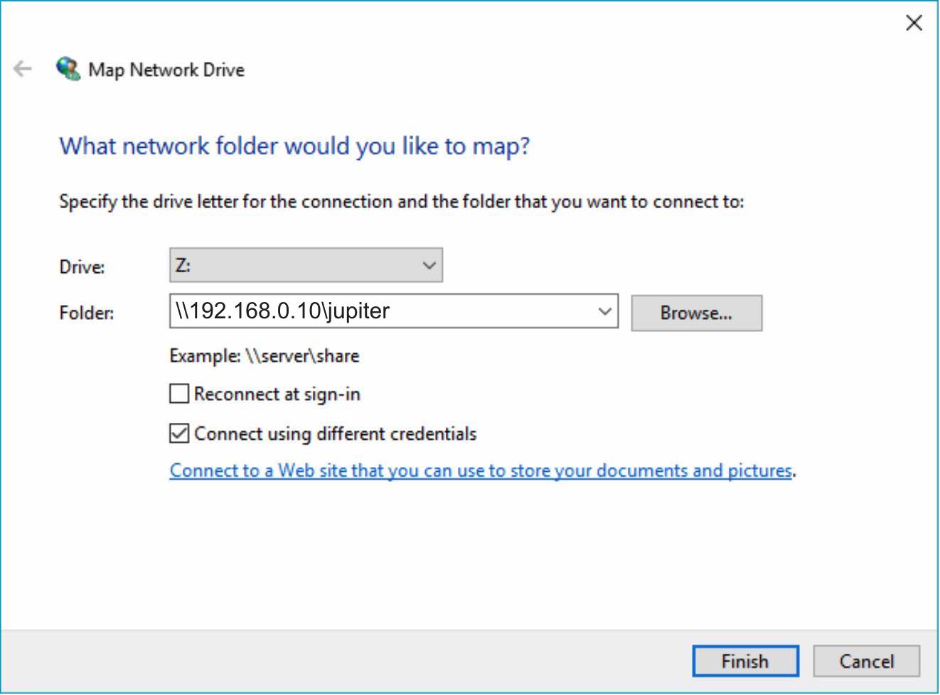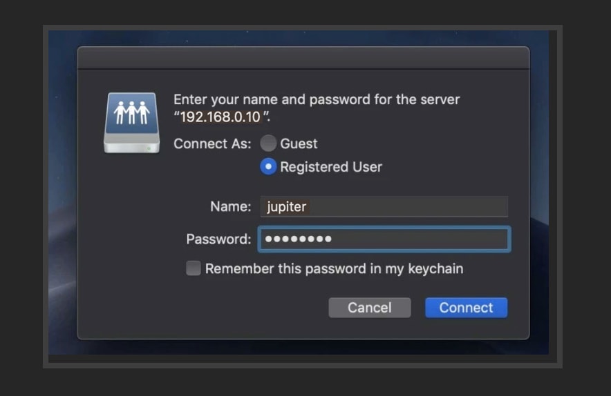3. If the OWC Jupiter Mini's network was connected using the DHCP Setup, enter the device's DHCP IP address (ex. \\172.21.124.254\jupiter). If the OWC Jupiter Mini's network was connected using the Static IP Setup, enter the device's Static IP address (ex. \\192.168.0.10\jupiter) as the Server Address and click "Connect".