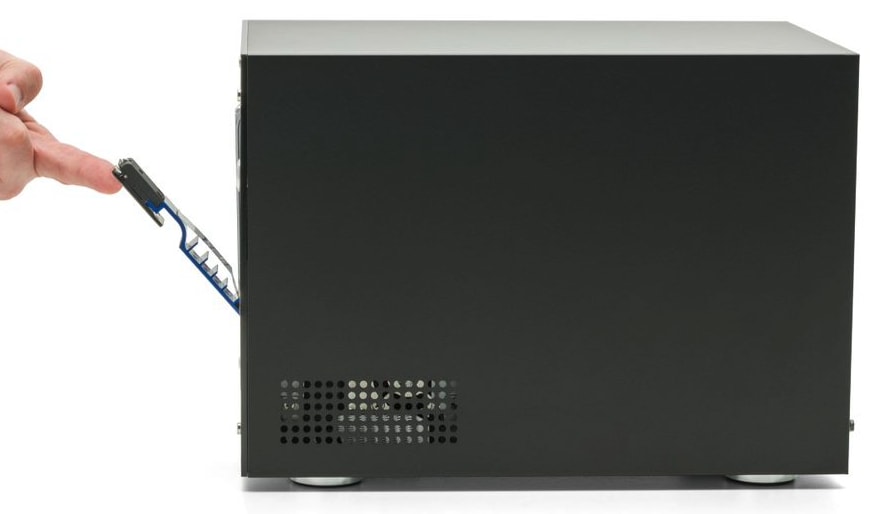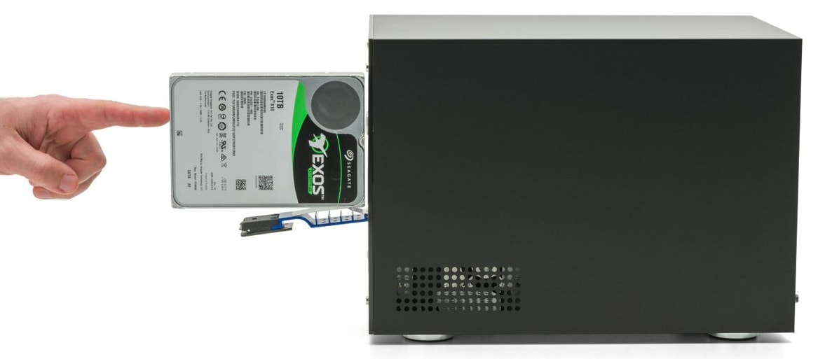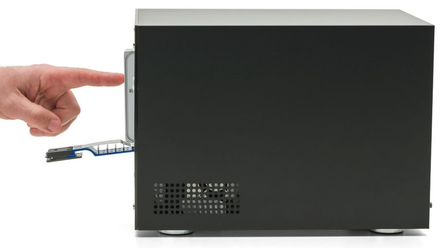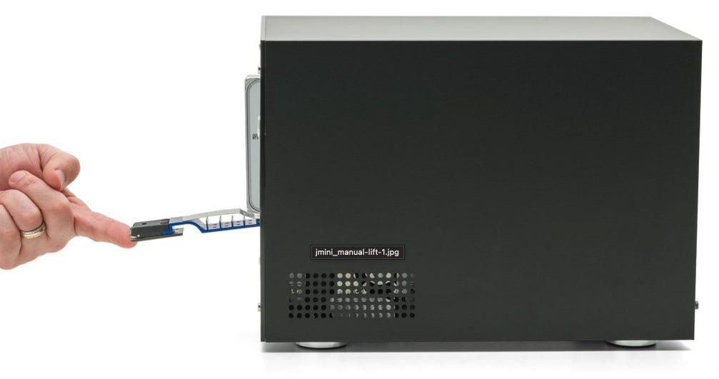 2. Obtain drive bay access to install the (5) drives shipped outside the Jupiter Mini. Lift the black lever and slightly pull downwards to disengage the drive bay door.