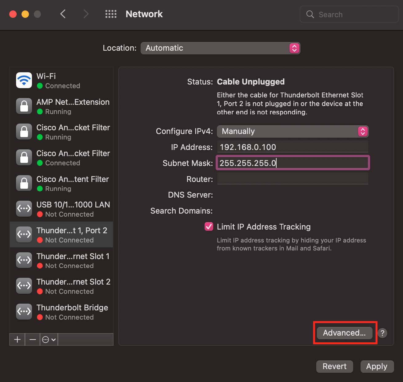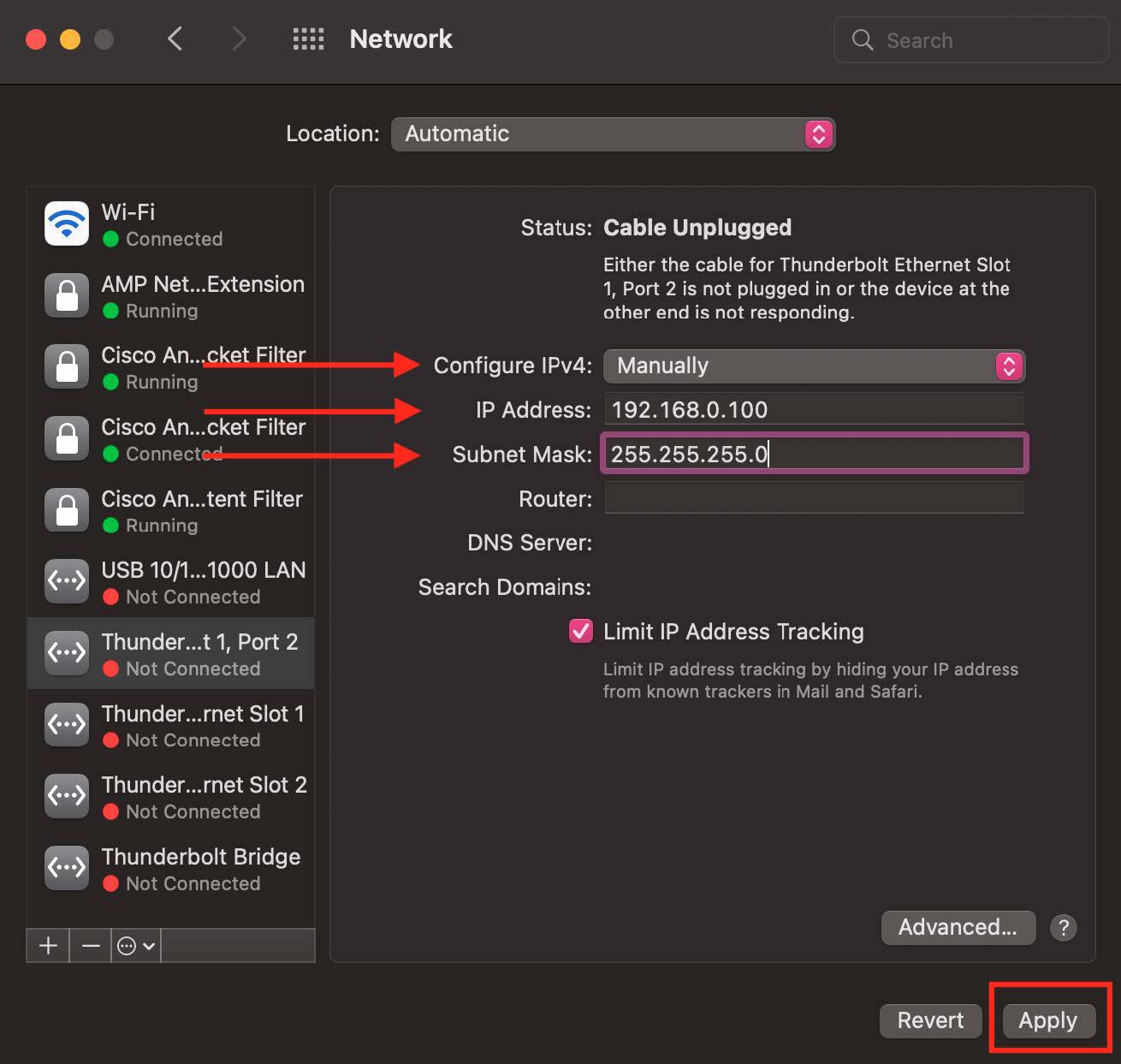 5. Change the "Configure IPv4" field to Manually, enter the Static IP Address 192.168.0.100 into the "IP Address" field, and ensure the "Subnet Mask" is 255.255.255.0. Click "Apply" to save the configuration.