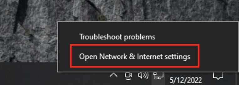 1. The network adapter connected to the OWC Jupiter Mini needs to have the network settings updated with the devices Static IP address. Navigate to and right-click the "Networking" icon in the lower right corner of the Windows desktop and select "Network & Internet Settings".