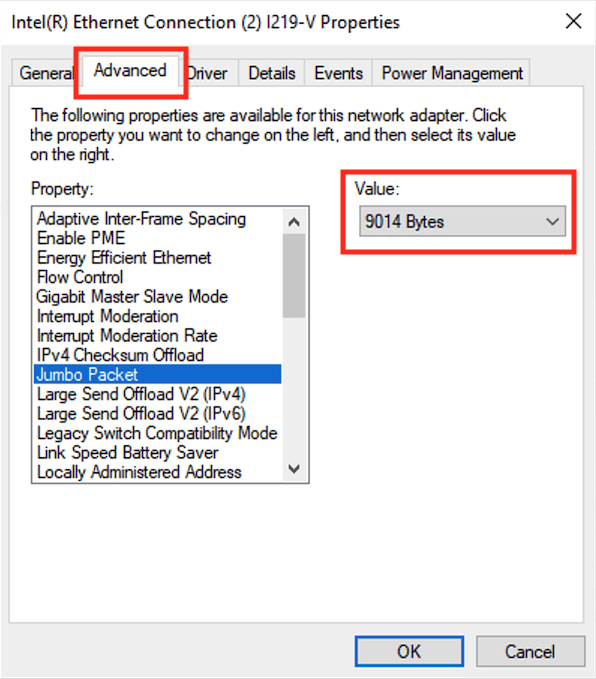 5. Select the "Advanced" tab and locate "Jumbo Frames" from the list of "Properties". Change the Value to 9014 Bytes. Click "OK" to confirm Jumbo Frame changes