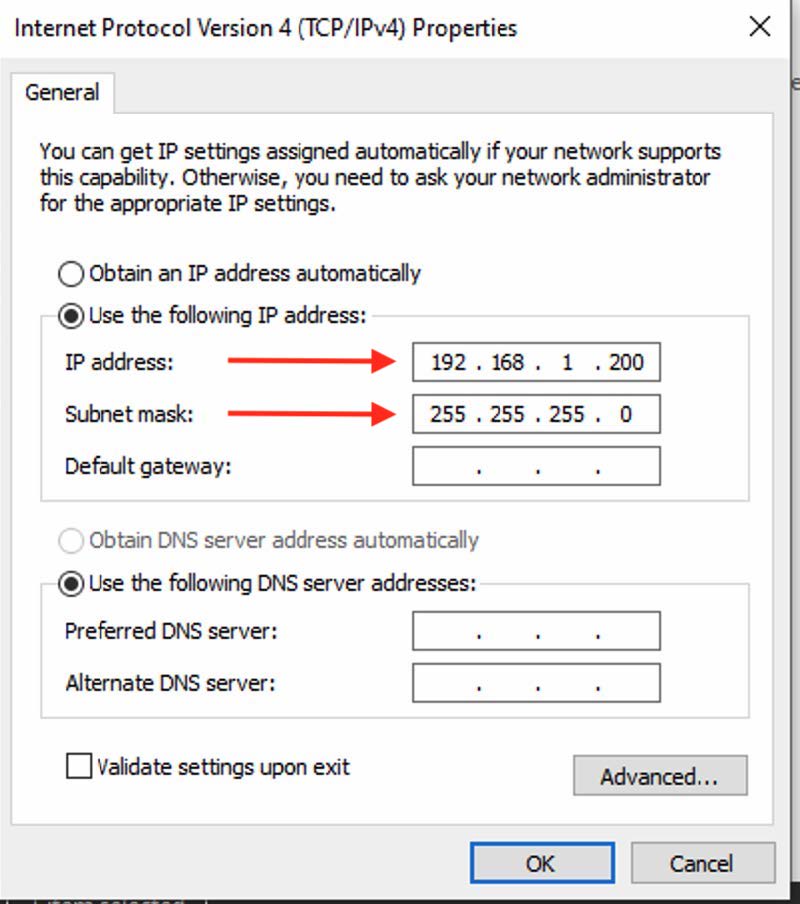 7. Select the option to Use the following IP address. Enter the Static IP Address 192.168.0.200 into the "IP Address" field and ensure the "Subnet Mask" is 255.255.255.0.