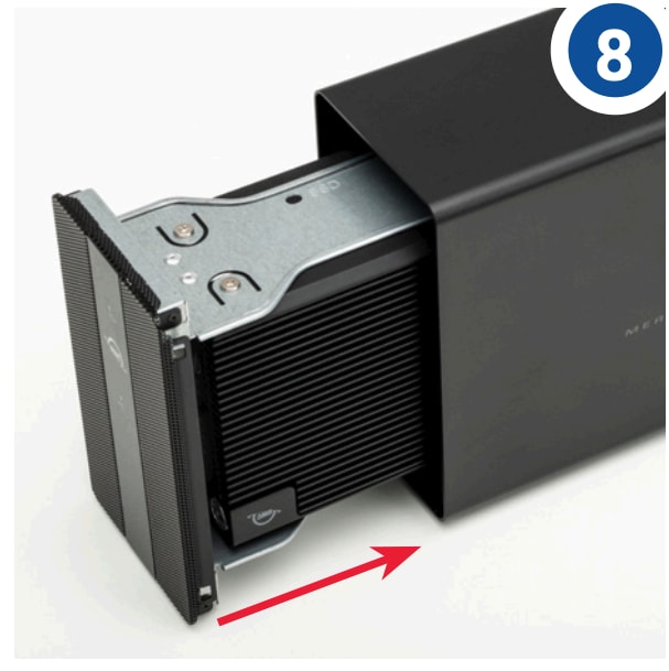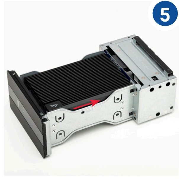 5. Making sure the connector on the shuttle aligns with the connector on the inner-chassis, place the shuttle into the housing. Then, connect the inner-chassis to the U2 Shuttle by sliding it in the direction shown until it is fully seated. If the device does not seat fully, do not apply more force. Move it back and try again. As long as the OWC U2 Shuttle is sitting flush in the drive carrier, the connectors should automatically align.