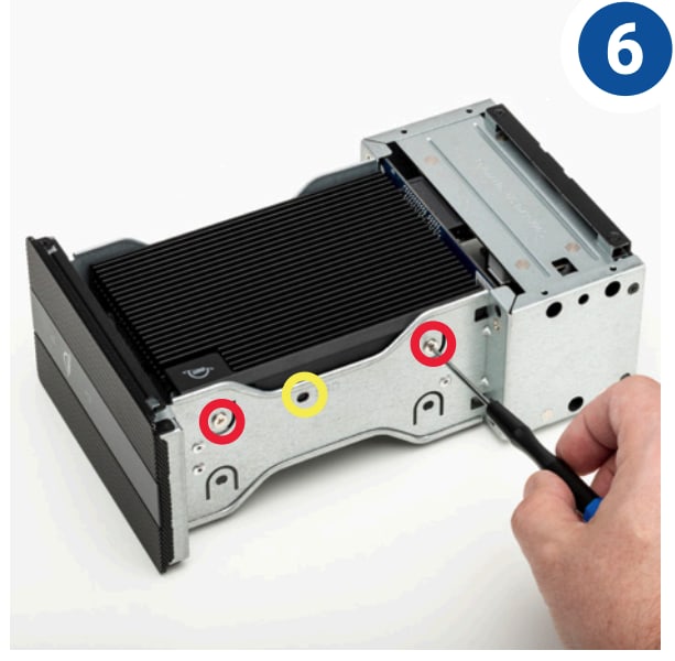 6. Affix the U2 Shuttle to the inner-chassis at the locations shown. Note: the hole for a 2.5 inch U.2 drive is circled in yellow. A total of one screw is required for 2.5 inch drives, and four screws (two aside) for 3.5 inch drives and the OWC U.2 Shuttle.