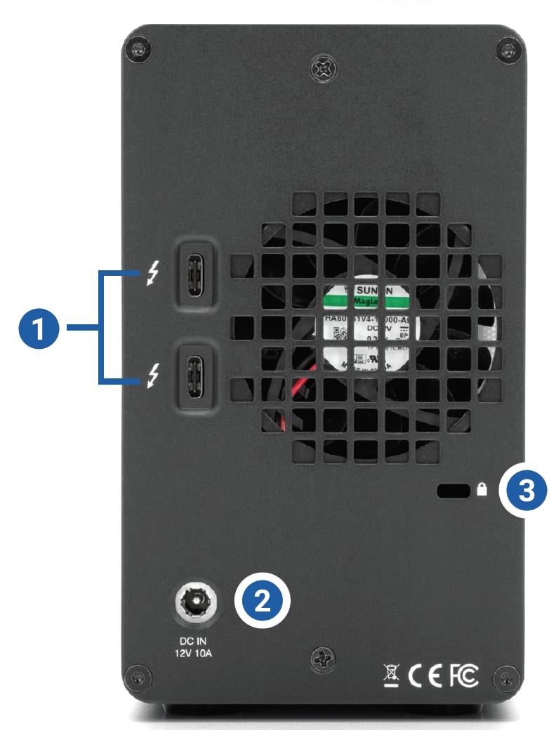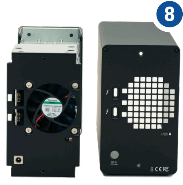 - Connect the included Thunderbolt cable to the Thunderbolt 3 port located on the back of the OWC Mercury Pro U.2 Dual and into a computer.
