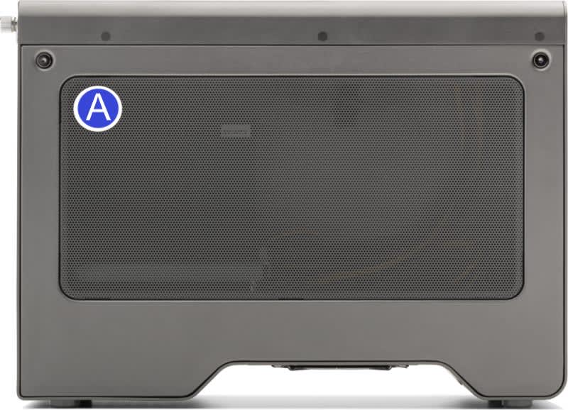 - Connect the included Thunderbolt cable into the Thunderbolt 3 port located on the back of the OWC Node Titan SE and into a system. The LED indicator will illuminate a solid blue.