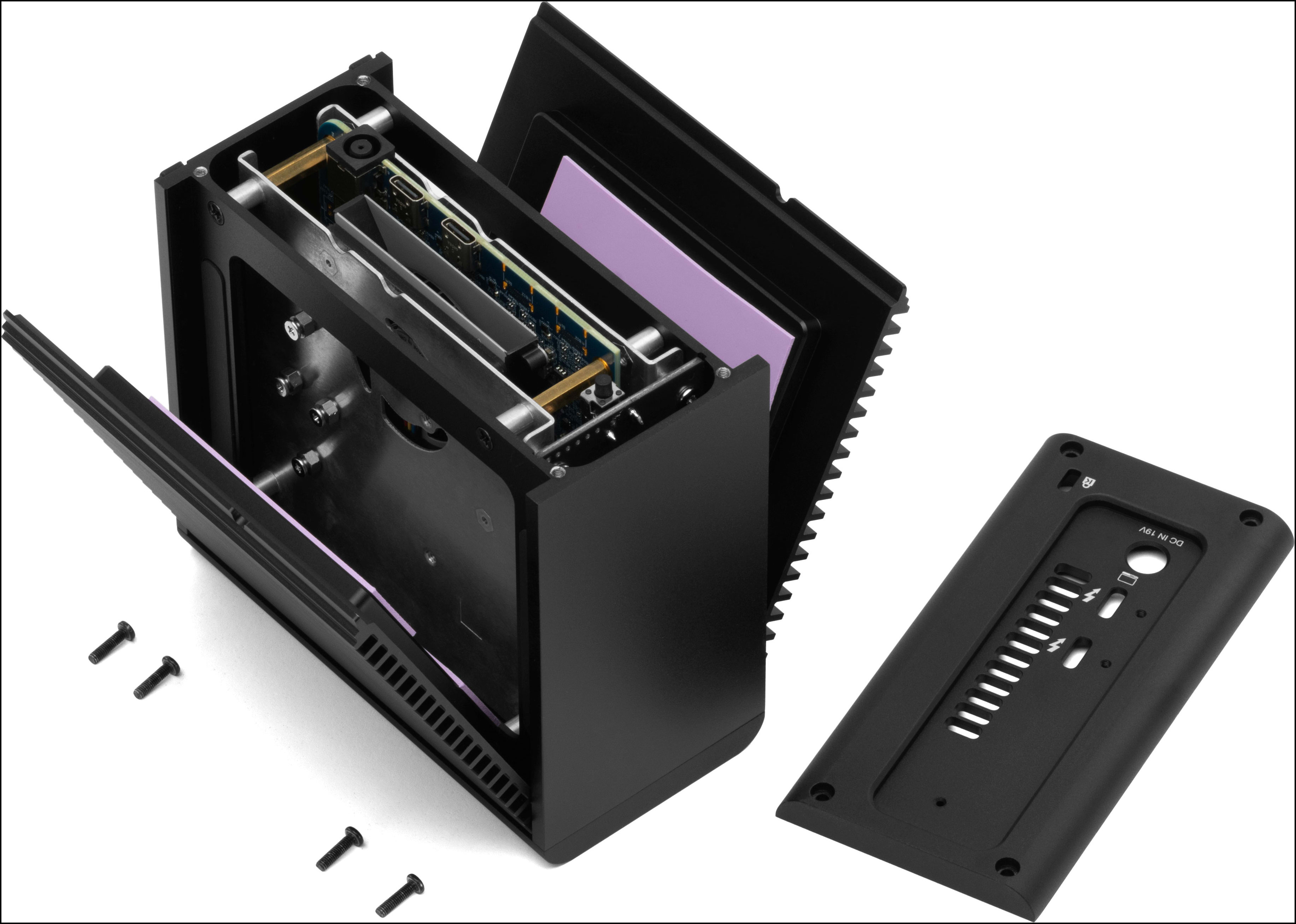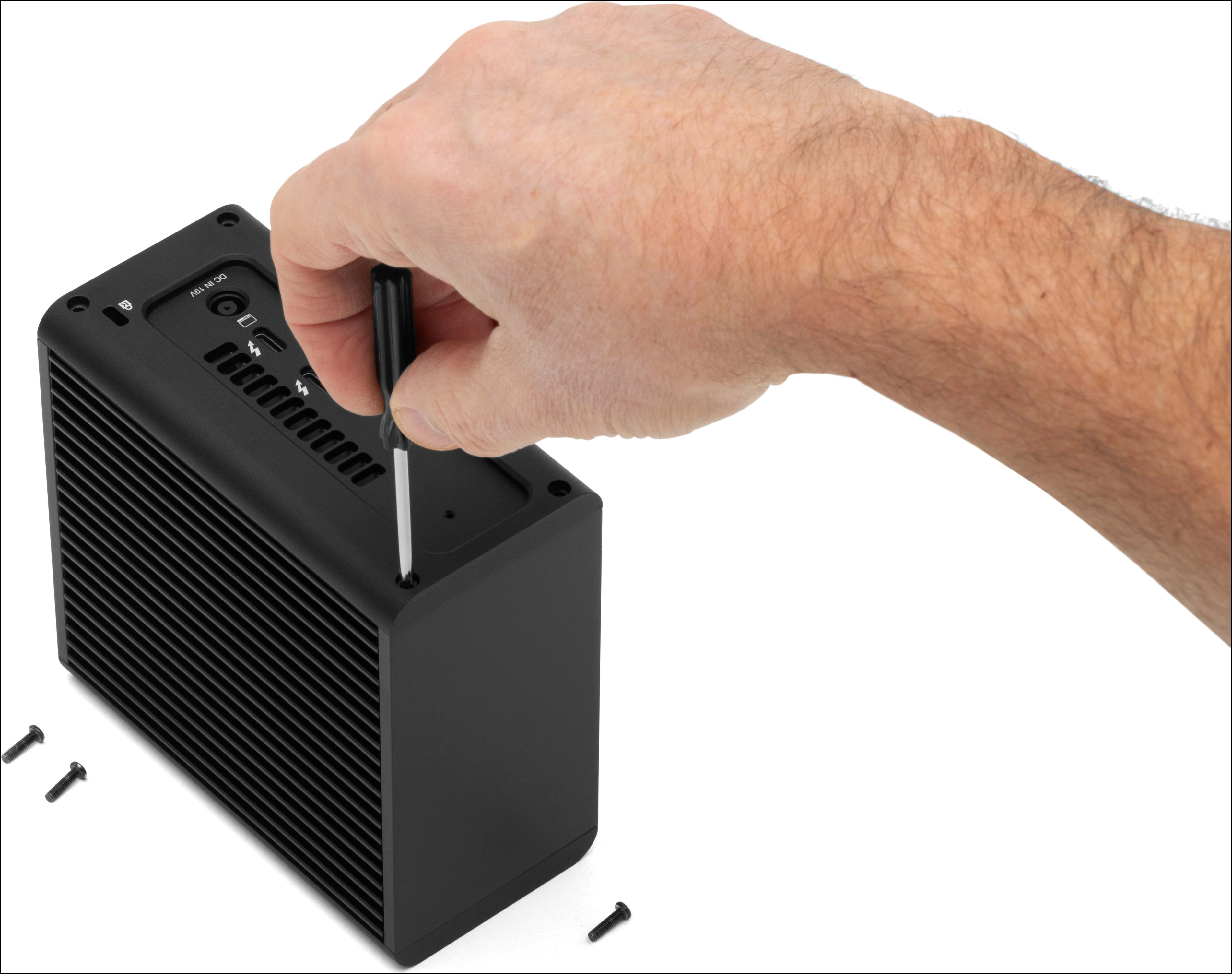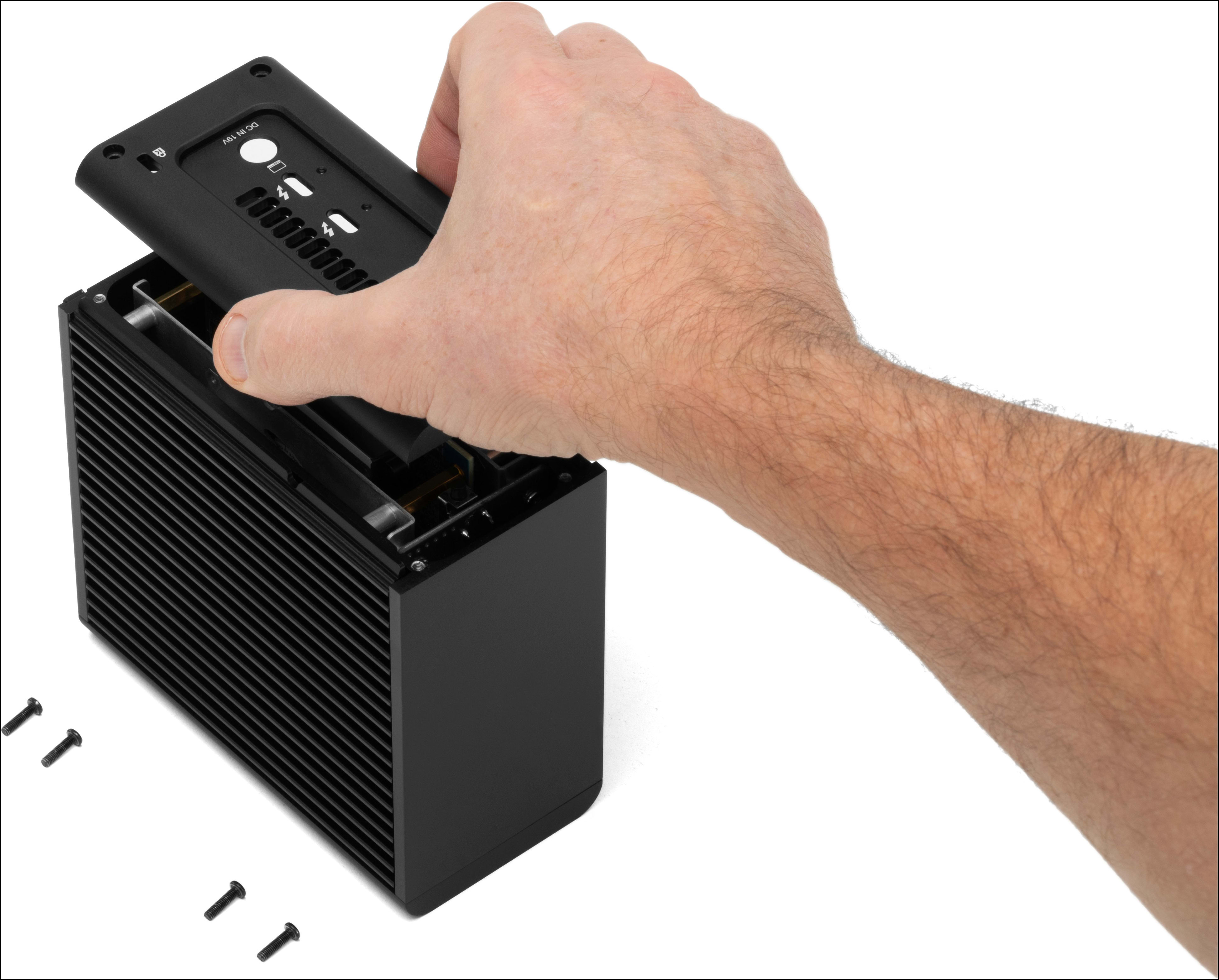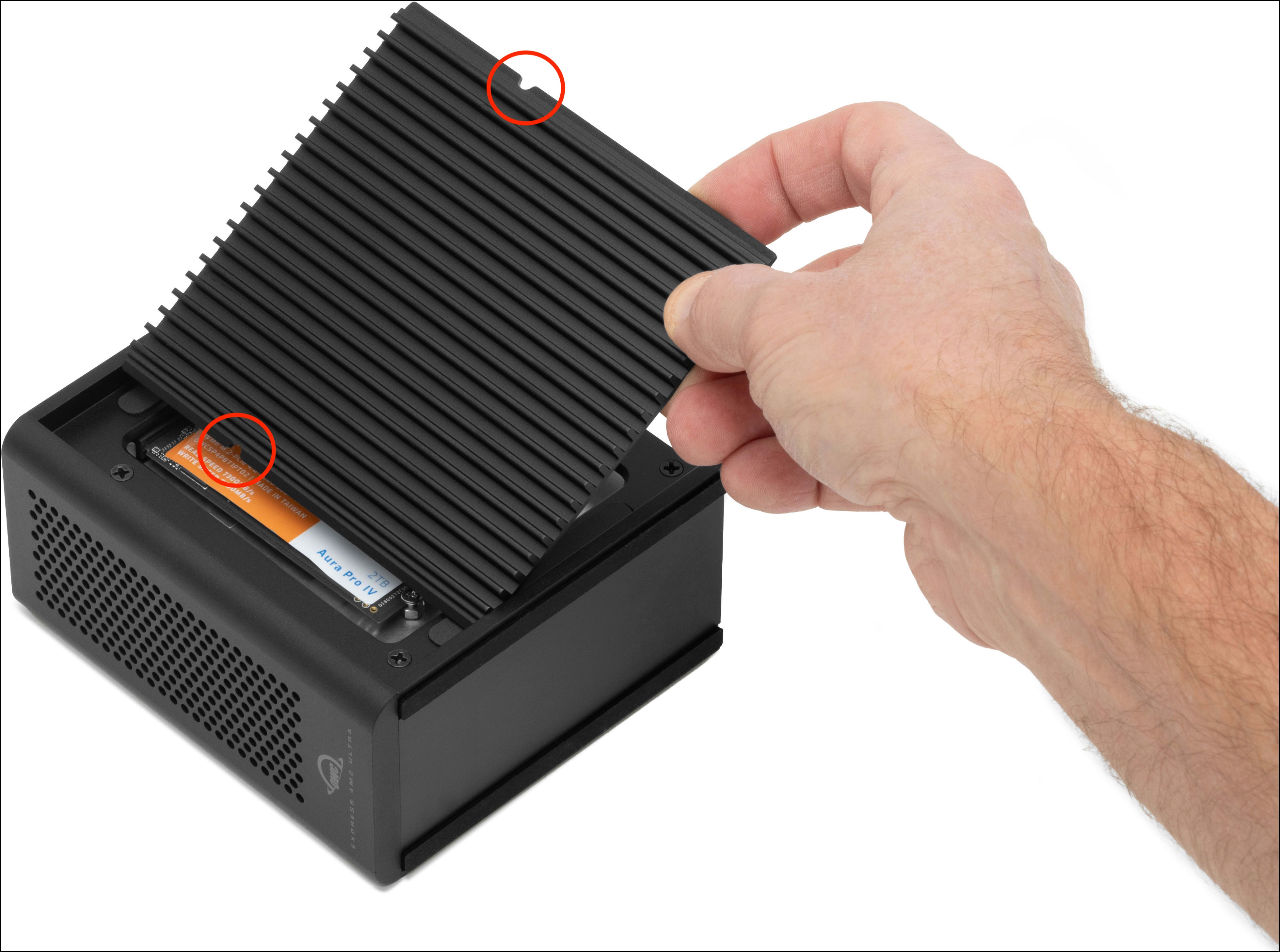 4. Repeat this an additional time. Flip the enclosure over to reveal the other (2) drive bays. Repeat the drive installation process resulting in (4) installed 2280 NVMe M.2 SSDs.