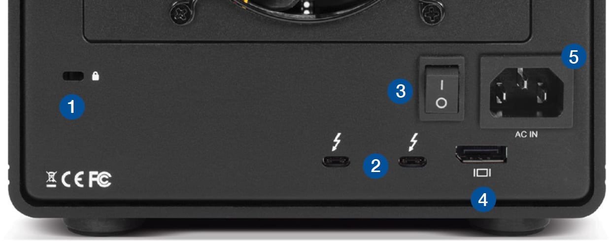 - Connect the included Thunderbolt cable to the Thunderbolt 3 port located on the back of the OWC ThunderBay 6 and into a computer.