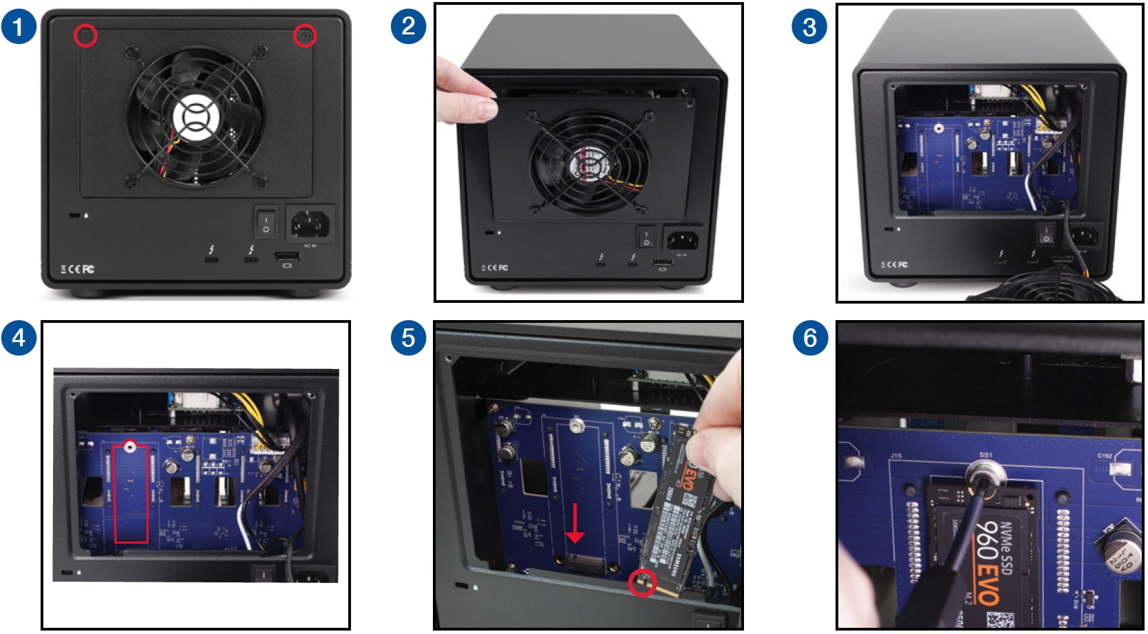 Follow the steps shown below to install the optional M.2 drive. This drive can be formatted and used like any other, including with SoftRAID arrays. NVMe and AHCI M.2 SSDs are both supported.