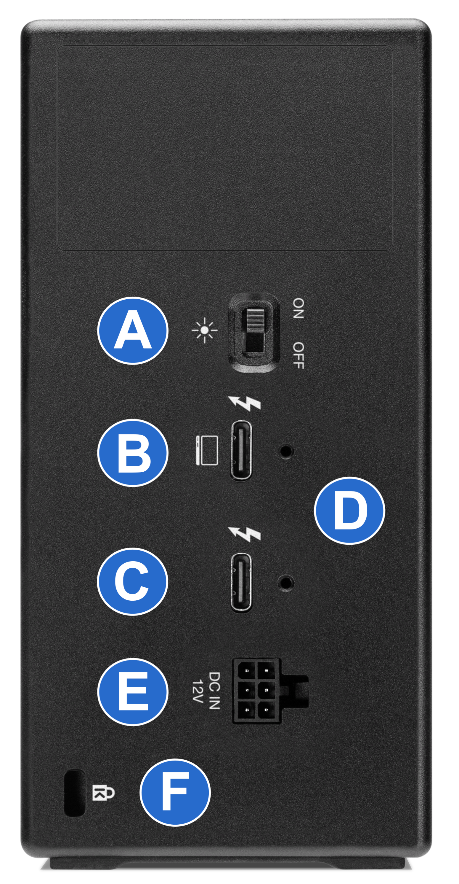 E. 6-Pin DC IN 12V Power Port - Connect the power cable to power the device