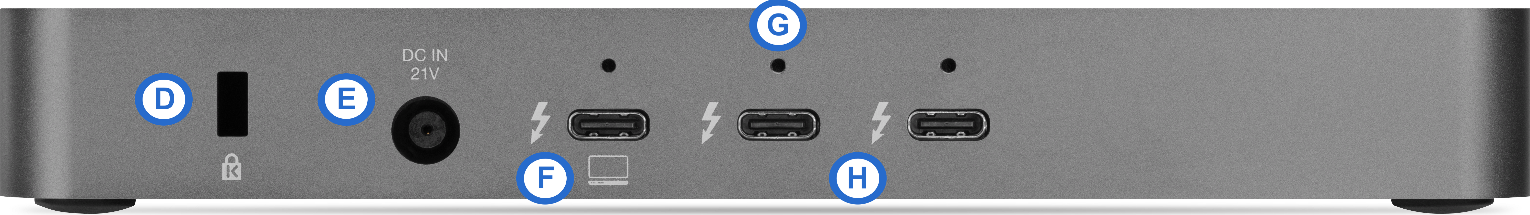 F. Thunderbolt 5 Host Port – Connect the included Thunderbolt 5 cable to the hub and compatible host system.