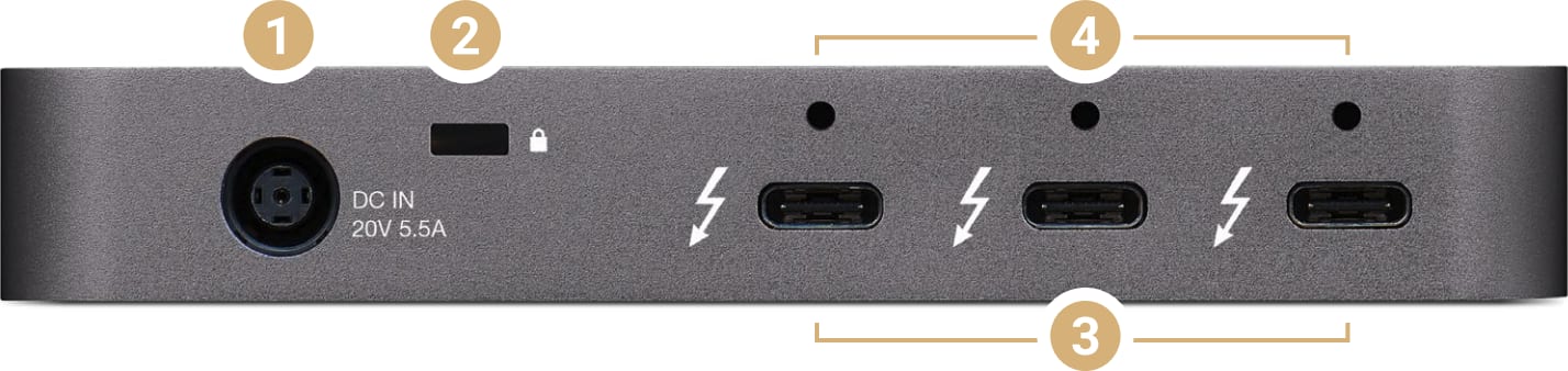 - Thunderbolt host port – Connect to a Thunderbolt 3 or later system. Provides up to 60W of Power Delivery for laptop battery charging.