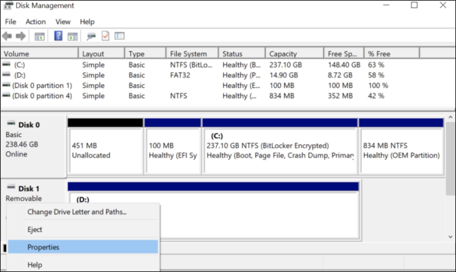 5. In the lower section of the Disk Management window, right-click the label of the device, and the select Properties.