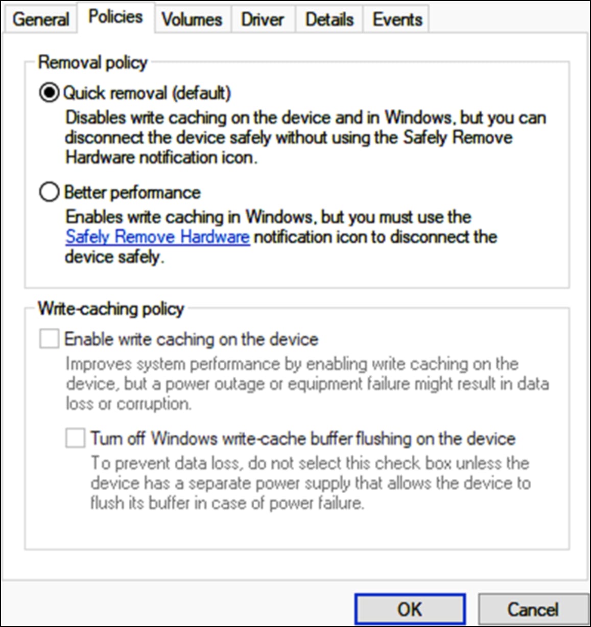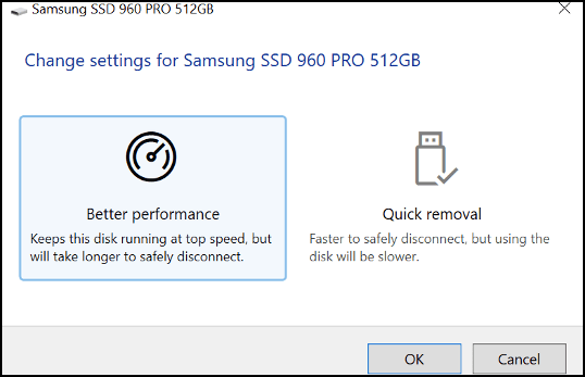 5. Two options become available ‘Better performance’ and ‘Quick removal’. Select the desired setting and click OK.