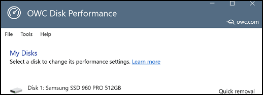 The OWC Disk Performance tool allows Windows 10 and later users to easily change Windows disk removal policy to favor "better performance" or "quick removal" with just a click.