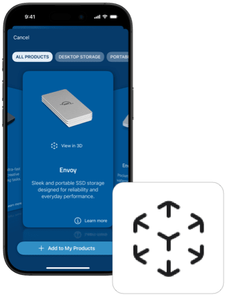 My OWC’s built-in AR (augmented reality) feature enables you to see true-to-scale 3D models of select OWC products right in your own workspace. Place a ThunderBay 8 next to your computer or see just how tiny an Envoy portable drive really is. It’s a fun, easy way to get a feel for the size and look of an OWC product before you plug it in. Move it around, check the fit, and plan your layout like a pro!