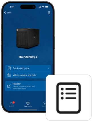 The My OWC app makes it easier than ever to get started using your OWC product. With quick access to manuals and other support resources, you’ll be an OWC product expert in no time. But the app goes far beyond just getting you started with your OWC solution, it can also keep you informed of product specific updates and alerts — helping you avoid issues and stay up to date with the latest improvements. Whether it’s a firmware patch, compatibility note, or a performance tip, My OWC ensures you always get the best performance from your OWC solution.