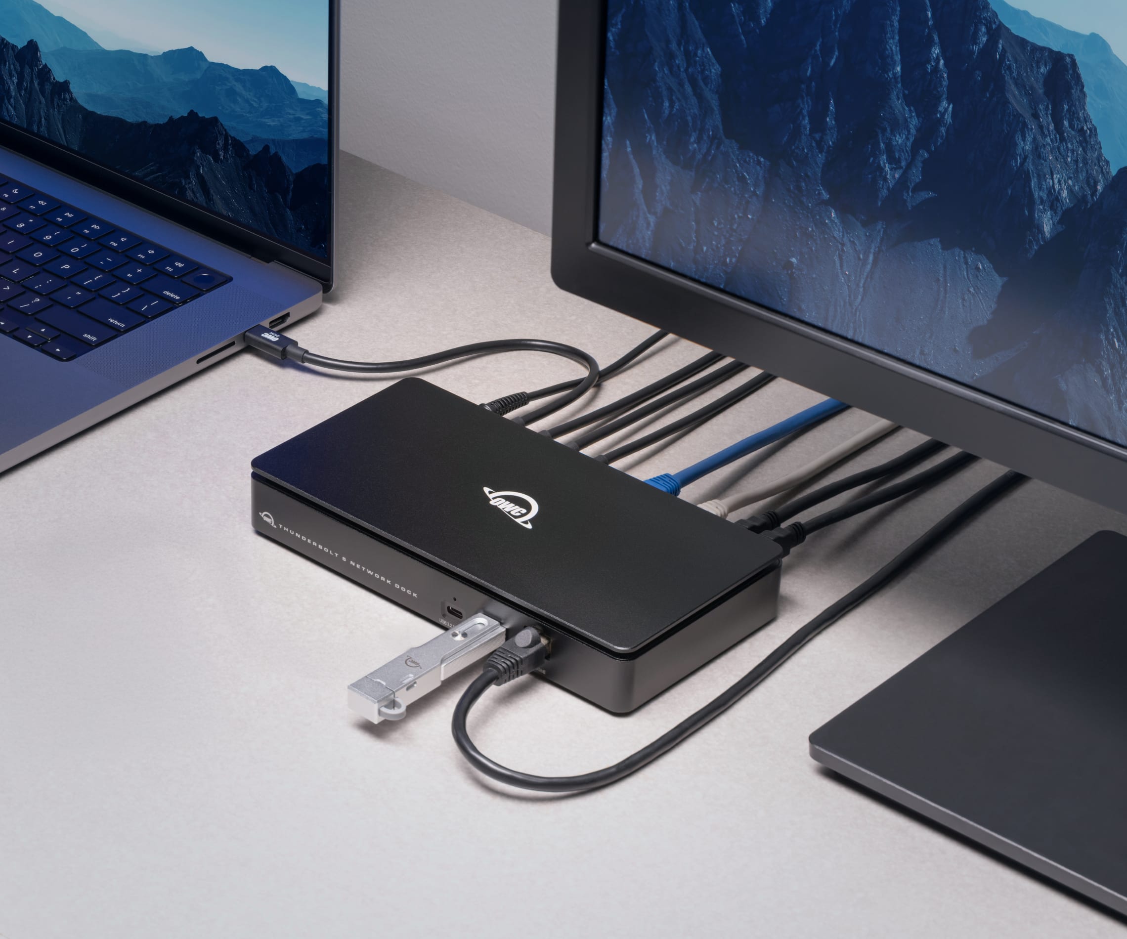 The OWC Thunderbolt 5 Dual 10GbE Network Dock comes with a certified 0.7M OWC Thunderbolt 5 (USB-C) Cable. If your workflow demands a specific length to make the connection, OWC Thunderbolt 5 (USB-C) Cables are available in a variety of lengths.