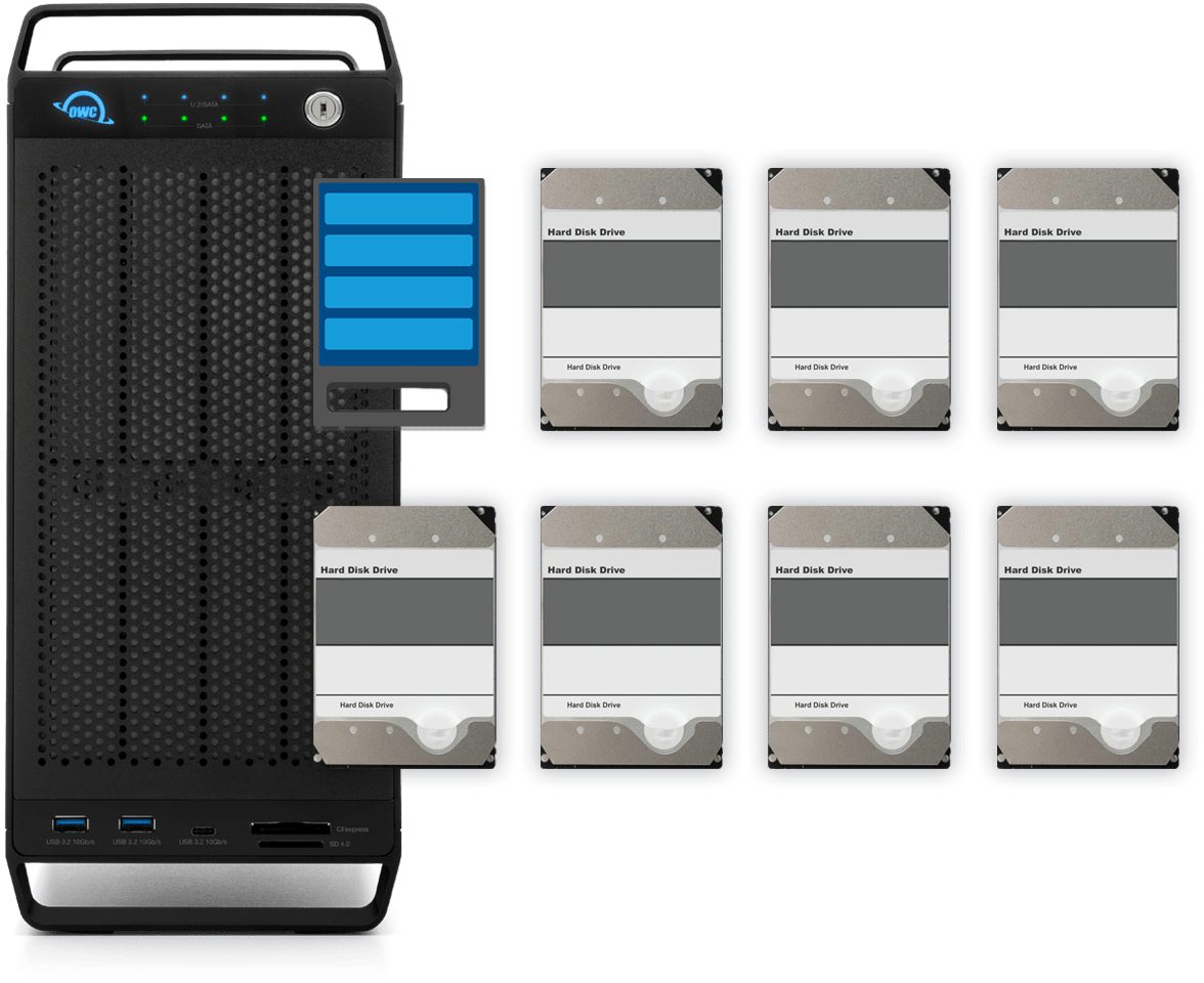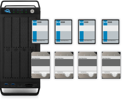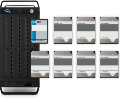Featuring an OWC U2 Shuttle with four NVMe M.2 drives in one bay, you can RAID them to ingest and edit live with incredible performance. Then use the U2 Shuttle as a transport drive for lab processing. Edit and store entire projects on the ultra-capacity HDD RAID 5 array. Plus, select a recommended PCIe card or add your own.