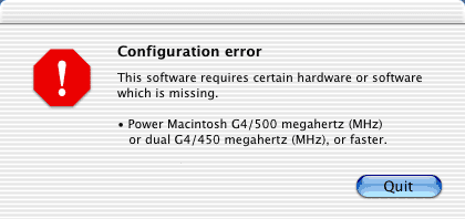 Error dialog box when trying to launch Final Cut Pro 4 on an unsupported system.