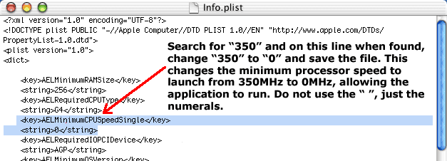 Lines 11 and 12 will show this string of text highlighted in blue here. The value <string>350</string> needs to be changed to report as <string>0</string>. Note the change from 350 to 0 - that means any speed processor can launch Final Cut Pro now!